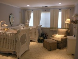 This fabulous room seems to be a combination of the traditional and modern. Nursery Notations (my favorite nursery design blog by Andrika King) shared this twin nursery, featuring the Dylan crib set from Serena & Lily. I love the shag cream rug and the muted notes. Very tranquil place for napping babies.