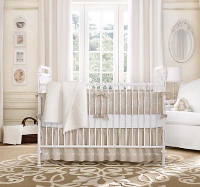Neutral nurseries invoke the calm, peaceful, serene feelings that I’m hoping to create. Restoration Hardware has this traditional nursery with a brass bed and the Embroidered Trellis set. Perfect, if you are a fan of linen, which by the way I am, but I’m not a fan of the white rocker. Twins + white = stains galore!