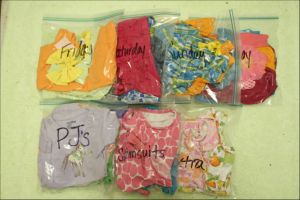 We’re taking our girls’ first road trip today. Packing for 2 has morphed to packing for 4. Most of the time I like Kaitlyn and Ava to “coordinate”, not “match”. To simplify mornings,  I sorted each girls’ outfits, along with matching bows, stored them in a ziploc bag, and labeled each bag by day.  This allows my hubby to gracefully dress the girls without the the confusion of knowing what day and which outfit “coordinates” with what. The easier I can make tasks for my hubby, the easier it is for him to let me sleep in while on our vacation.  Thanks dear!