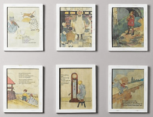 Restoration Hardware Baby & Child had this lovely collection of Mother Goose Nursery Rhyme art in 2011.  I found the book for $10 at Amazon, cut out the pages, and picked up the white 8×10 frames for $3.99 at Target, totaling $25.62 for 6.  Just lovely.