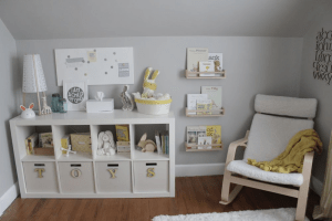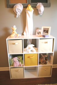 I loooved this room on Project Nursery.  I prefer her room, but ours is comfy. Ikea has this wonderful shelving unit for 89.99, but alas shipping and handling to Mississippi would cost me a whopping $349. (Oh, if we only had an Ikea in town.) Target had a similar unit, the  ClosetMaid Cubeicals 6 Cube Organizer for $34.99.  One day, I may still upgrade to the Ikea unit.