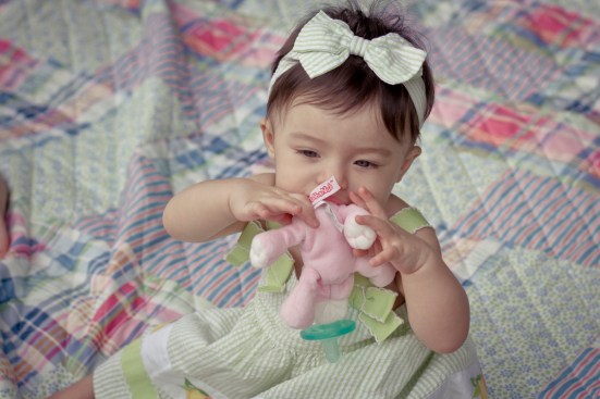 Kaitlyn (below) is not addicted to her pacie and prefers to chew on the stuffed animal.